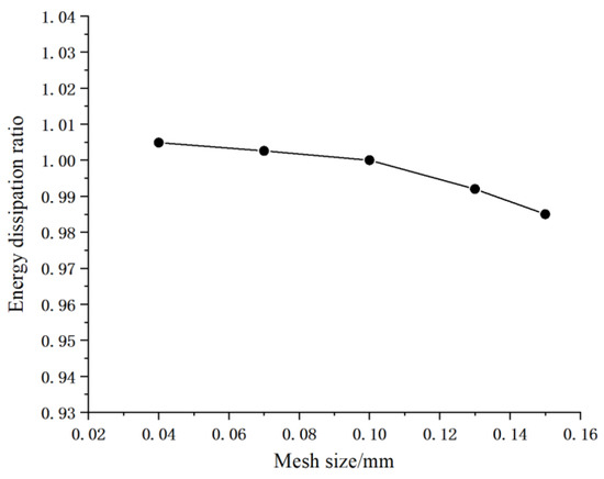 To eliminate the errors caused by the quality and quantity of the grid during the analysis process on the calculation results, this study adopts the grid sensitivity verification method. At the sealing surface of the premium connection, when the displacement amplitude is 0.03 mm at 80 MPa. Analyze the energy dissipation of the sealing surface of the premium connection obtained from grid sizes of 0.04–0.15 mm. To facilitate the comparison of the influence of load types on grid sensitivity, the energy dissipation under different grid sizes is regularized. The energy dissipation ratio for a grid size of 0.1 mm is 1, and the energy dissipation for other grid sizes is divided by the energy dissipation value of 0.1 mm. The energy dissipation ratio of different grid sizes under an internal pressure of 80 MPa. As shown in Figure 7. The results indicate that as the grid size decreases or increases, the impact of grid size on energy dissipation is very small, with errors far less than 1%. It can be considered that, under displacement load conditions, the use of the Abaqus modeling method to calculate energy dissipation is not affected by grid size.