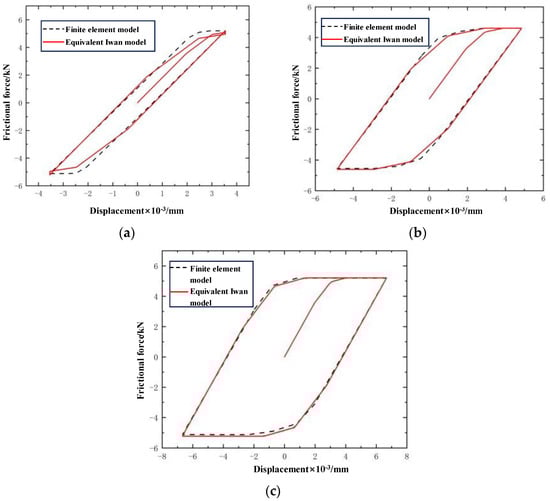 A comparison of hysteresis curves between the iwan and finite element models. (a) A = 0.03 mm; (b) A = 0.04 mm; (c) A = 0.05 mm.