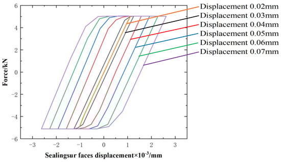 Figure 10 shows the force–displacement hysteresis curves at the sealing surface under different displacement amplitudes for the premium connection with an internal pressure of 80 MPa. As shown in the figure, with the increase in the displacement amplitude, the displacement of the sealing surface increases, while the complete slip critical force remains unchanged. At a displacement amplitude of 0.02 mm, the force–displacement hysteresis curve is almost a straight line, while the sealing surface is in a completely adhesive state and no relative sliding occurs. When the displacement amplitude is 0.03 mm, the force–displacement hysteresis curve does not appear to have an obvious horizontal section, indicating that the sealing surface is in a partial slip state. When the displacement amplitude is between 0.04 and 0.07 mm, the force–displacement hysteresis curve shows an obvious horizontal section, indicating that the sealing surface has completely slipped. Moreover, with the displacement increases, the proportion of complete slip increases.