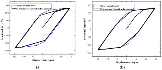 There are many parameter choices for the Iwan model, such as the 4-parameter Iwan model [], 5-parameter Iwan model [], and 6-parameter Iwan model []. In the final results, obtained by using the discrete Iwan model with different parameters, as the number of Jenkins element increases, the calculation accuracy is higher and more in line with reality. However, considering the amount of calculation and efficiency, the calculation process should be simplified to meet the accuracy condition. For this reason, the hysteresis curve of the Iwan model of the premium connection with 2–5 parameters compared in this section is shown in Figure 12. The more Jenkins elements that constitute the discrete Iwan model, the higher the similarity between the hysteresis curves of the discrete Iwan model and the finite element analysis model. Table 3 shows that, when there are four Jenkins elements in the discrete Iwan model, its similarity with the hysteresis curve of the finite element model reaches 98.8%. This not only takes into account the computational efficiency but also can effectively simulate the microslip contact behavior of the premium connection.