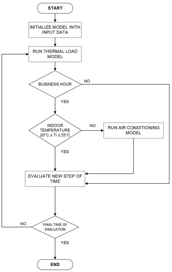 The model considers a time step between the simulations carried out, as our database is in one-minute steps. For each step of the simulation the calculation of the thermal load of the environment is calculating using the information from the thermal load. The temperature of the environment is also calculated. If this temperature is higher than the limit defined as the comfort temperature, a simulation of the air conditioning system is carried out to reduce the temperature or the TES is discharged and is maintained within the defined parameters.