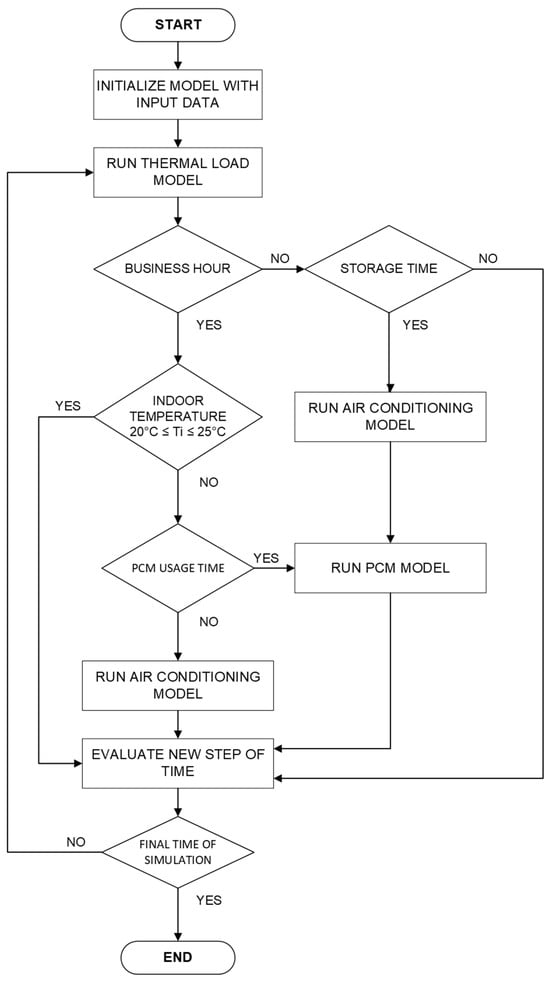 The algorithm of the mathematical model that was applied to simulate different scenarios and operating conditions, and produce reliable output data is presented in Figure 2, Figure 3 and Figure 4. Figure 2 shows a flow chart of the model for direct cold energy used. Figure 3 shows the flow chart of the model using the discharging TES during the peak time. For the cases presented in Figure 2 and Figure 3, first, the thermal load model is run. Then, the operating time, indoor temperature and PCM usage are checked. Afterward, the air conditioning model or the PCM model is run. In addition, for part of the night, the air conditioning is run to charge the TES as presented in Figure 3.
