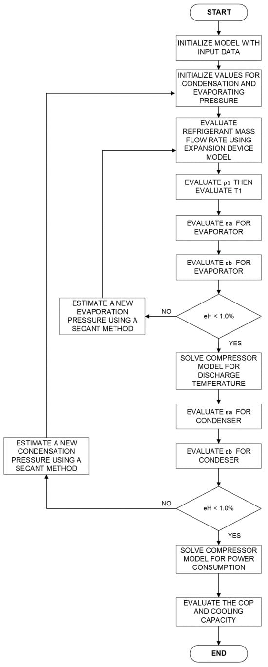 Figure 4 shows the flowchart of the air conditioning model. After the input data and initialization values, the model proceeds to obtain the evaporator conditions. These variables are the output of the model, but the values are initially estimated and later corrected by trial and error. Specific equations are used in each control volume in the boiling and superheating region. A similar procedure is then used for the condenser after utilizing the compressor model. Specific equations are used in each control volume in the desuperheating, condensation and subcooling regions. The secant method is used to speed up the convergence of the model. This is performed for each time step until the model converges. The following section presents the equations used in the model.