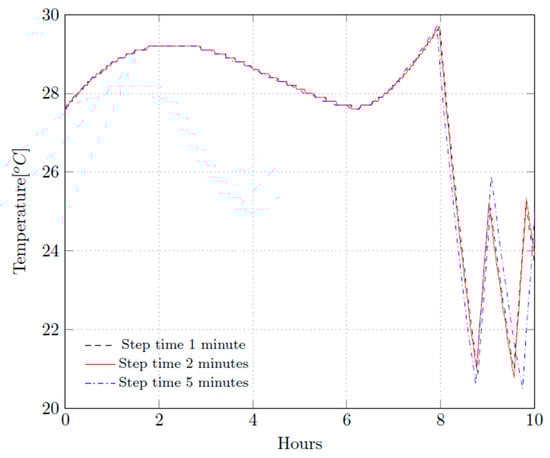 The simulated results are described in this section. Initially, the time step is analyzed as illustrated in Figure 5. Smaller time steps, such as one minute, do not offer an advantage over a two-minute time step. This is because a small-time step requires more time to process the simulation. Conversely, a large time step, such as five minutes, is chosen producing different results, as indicated in Figure 5. Therefore, a time step of two minutes is selected.