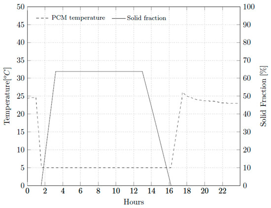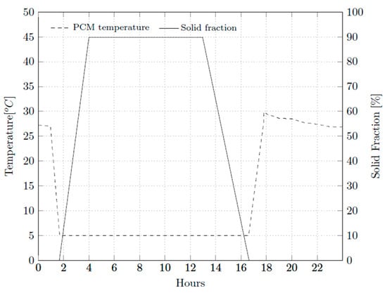 Figure 7 and Figure 8 illustrate the behavior of the PCM during the charging, storage, and discharging processes. During the period of charging, from 01:00 to 04:00, there is an increase in stored energy. At the beginning of the charging process, the material temperature drops, as does the start of the solidification process. The solidification process starts around 01:42, and 89.8 of the mass of 610.0 kg of PCM solidifies. From 04:00 to 13:00, there is the PCM energy storage phase, during which the accumulated energy, temperature and solidification are maintained. After 13:00 the PCM discharge process begins. At the beginning of the process, the temperature remains constant, while the stored heat and the solid fraction are reduced until all the stored heat is dissipated by the thermal load of the environment.
