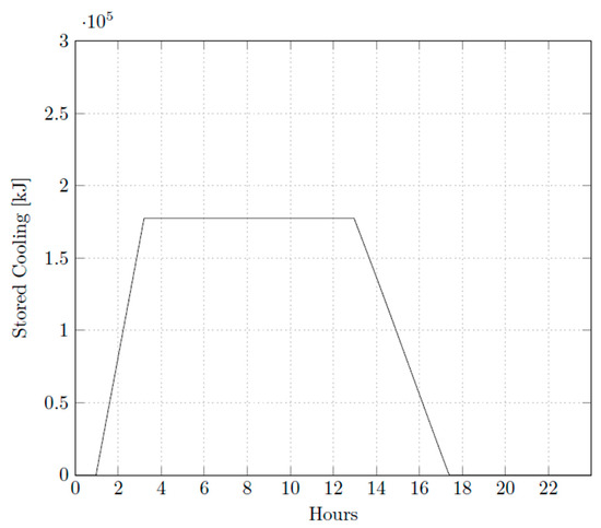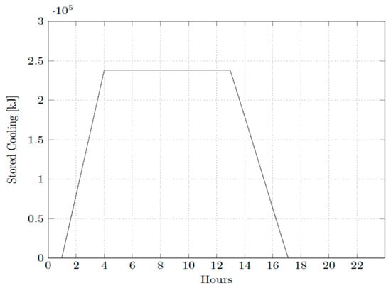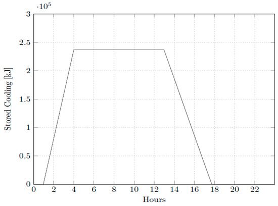 The general input data for the thermal load calculation are shown in Table 2. Table 3 presents the TES input data and Table 4 shows the refrigeration cycle input data. Using the data mathematical model that was applied to simulate the scenarios, the following was established: (a) direct cold energy used (as shown in Figure 2); (b) discharging TES (as shown in Figure 3); and (c) charging TES during the night (as shown in Figure 3). In addition, the air conditioning model is used for direct cold energy used and for charging TES (as shown in Figure 4).