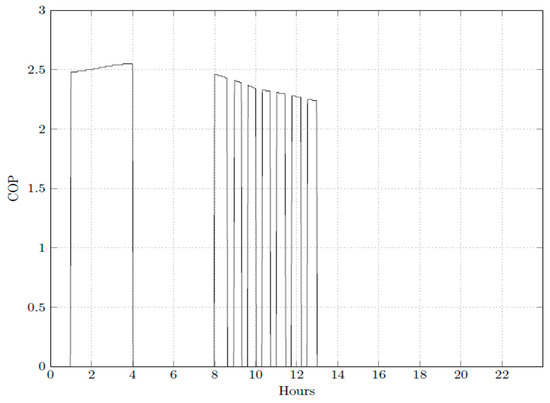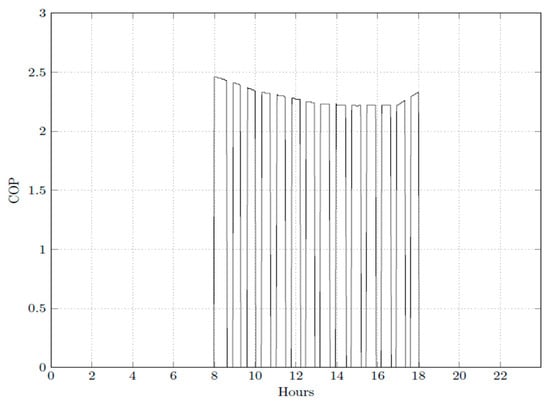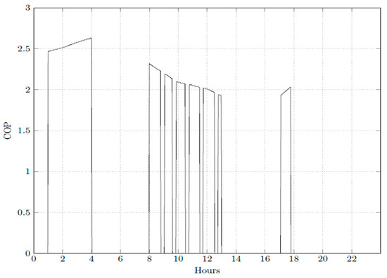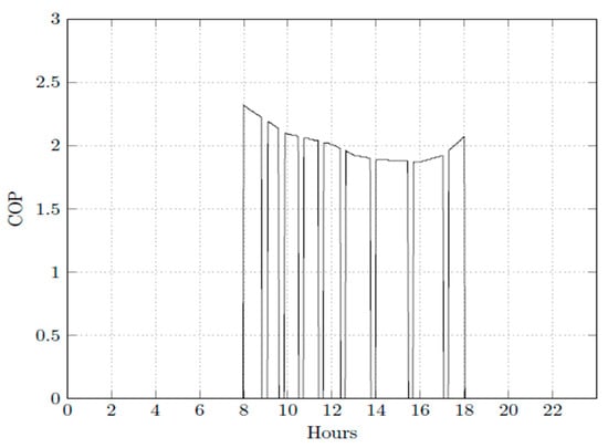 The efficiency of the operation of the air conditioning system in operation on 23 January 2019 can be seen in Figure 9 and Figure 10, where the COPR values are shown. The air conditioning system coupled with the TES has the same COPR values as the system without the TES during business hours, when the TES is not discharging. On the other hand the COPR average is 77.1% lower during the discharging period, 13:00 to 18:00, when compared to the charging period of the TES 01:00 to 04:00. The higher COPR values observed during the charging period of the TES are because cooling is easier during the nighttime, when outside temperatures are usually lower. During business hours, the COPR is the same as long as the air conditioner is the same. The COPG was taken into account in this simulation. During the charging period the highest value was 1.95, and the average was 1.93, which is 69.5% higher than the average for the system without TES during the discharging period, which had the highest value of 1.83.