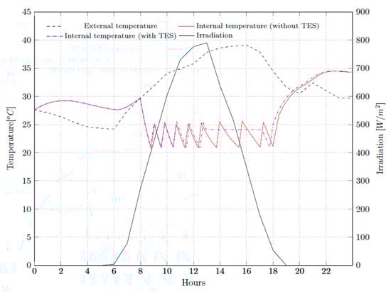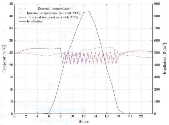 The thermal performance of the air conditioning system was numerically simulated during the selected day in the climatic conditions of Teresina. The highest sum of solar radiation rate occurred on 23 January 2019. The effect of the solar radiation was noted in the internal temperature in Figure 6, which shows the external and internal temperatures (with and without TES) of the simulated environment. Approximately three hours after the solar radiation rate started, it increased the heat gain of the environment. At the beginning of the business hour, it decreased because the air conditioning system started to work. When the air conditioning system was operating without using the TES and the temperature varies between the set limits, from 20 °C to 25 °C, throughout the entire operating cycle of the system, since the air conditioning system is coupled to the TES, the temperature at the beginning of the TES discharge period was maintained. This is because the simulation determined that all the thermal load generated from 13:00 onwards should be deducted from the energy stored in the TES until all of it is consumed.