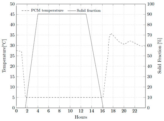 As aforementioned, the stored cooling was not sufficient for the whole discharge period, from 13:00 to 18:00. Figure 13 shows the PCM solid fraction, which achieves 90.3%. All the PCMs of the TES was melted before the end of the discharge period, and the temperature of the PCM started to increase until it reached the external temperature, once the TES was discharged, the flow no longer flowed through the TES.