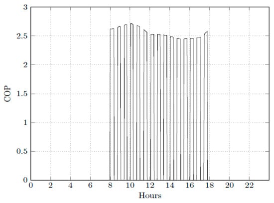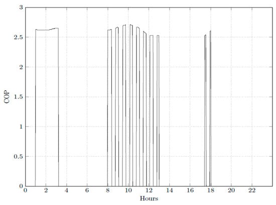 The performance of the air conditioning system operation on 20 December 2019 can be observed in Figure 14 and Figure 15, where the COPR values are shown. The air conditioning system coupled with the TES has a COPR average of 53.1% higher during the charging period, from 01:00 to 04:00, than during the discharging, from 13:00 to 18:00, for the system without TES. The higher COPR value observed during the charging period of the TES is 2.63, and the average during this period is 2.55. During business hours, the COPR of the air conditioning system with TES reappears when the system begins operating at the end of the afternoon.