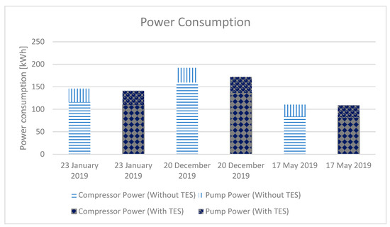 Electricity is consumed in the compressor when the air conditioner is running and, in the pump, when TES is charging and during business hours (for direct cold energy used and for discharging TES). The total energy consumption at the end of the day with and without TES is shown in Figure 21. It can be seen that the energy consumed by the pump in the air-conditioning system with TES is higher than in the system without TES because the pump remains in operation during the TES discharge period. Thus, in addition to working during the system charging period, the pump also remains in operation during business hours. On 23 January 2019, an air conditioner with TES saves 3.4% in electricity consumption. On 20 December 2019, an air conditioner with TES saves 10.6% in electricity consumption. On 17 May 2019, an air conditioner with TES saves 1.3% in power consumption, as shown.