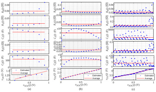 Plot of the j-th estimated parameters versus the corresponding j-th segment value of (blue points), and the average values of the ECM parameters and -linear function (red lines), of (a) nickel–metal hydride (NiMH), (b) lead-acid (Pb-acid), and (c) lithium-ion (Li-ion) batteries (at °C).