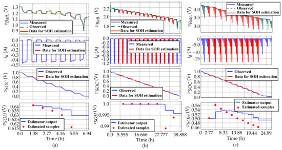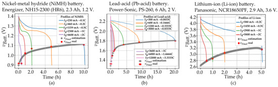 Discharge characteristics with estimation of (a) NiMH, (b) Pb-acid, and (c) Li-ion batteries (at °C).