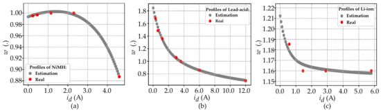 where the reference temperature T is not represented, although it is implicit and influences the value of the proportion; this relationship is illustrated as a proportion in Figure 5, using red dots to indicate the real values of W for the different current profiles , which are provided by the manufacturer datasheet in the discharge curves. The real values of the correlation W are used to define a nonlinear function of correlation for any time-variant value of (see the nonlinear function presented with gray dots in Figure 5). Then, it was decided to use the nonlinear relationship in (13), since this was the function that best approximated the correlation data for each battery technology.
