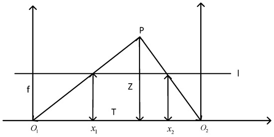 An RGB-D camera is a device that can capture distance information between objects in a scene and the camera, also known as a depth camera. As an emerging ranging hardware facility, a stereo depth camera calculates the distance from the object to the camera based on the disparity between corresponding pixel points of the same actual object in the images captured by the left and right cameras. The specific principle of stereo ranging is illustrated in Figure 5, where the baseline distance between the left and right cameras is denoted as T, and the focal length is f. The horizontal coordinates of the actual object point P on the image planes of the left and right cameras are and , respectively, with the corresponding disparity , and the distance from the object to the camera is . The key to stereo ranging technology is to calculate the pixel differences in corresponding points in the left and right images. However, due to severe interference from ambient lighting and the lack of distinctive features on objects at long distances, the ranging distance of stereo depth cameras is relatively limited.