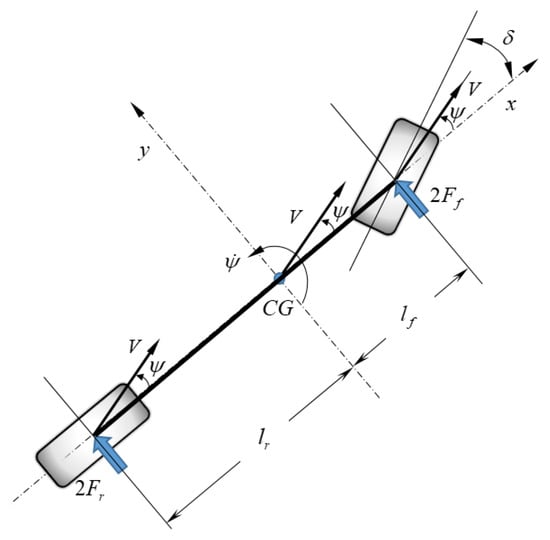 The equations of motion for a 2-DOF bicycle model for modeling 4WS autonomous vehicles (Figure 1) can be formulated in line with Newton’s second law as follows [53]: