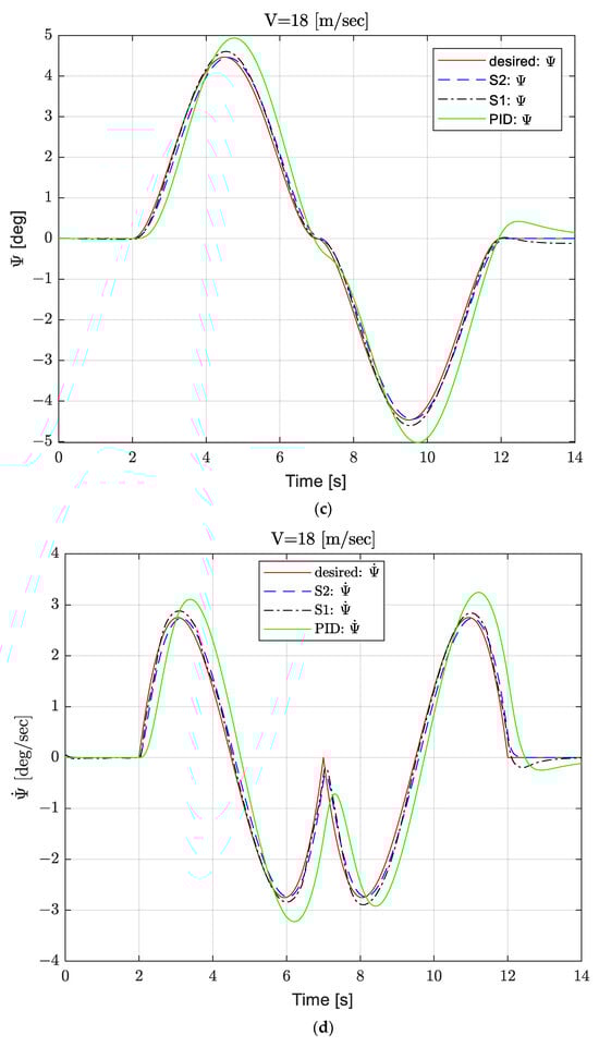 Figure 5b,c display the lateral velocities and yaw rates of 4WS AV. The yaw rates by the PID controller are much larger than those of the first and second block backstepping strategies, and there is a considerable difference in lateral velocity.