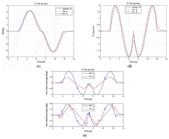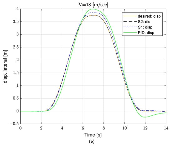 Figure 10 exhibits the simulation outputs of double-lane change movement on dissimilar road coefficients of friction (wet road μ = 0.6, dry road μ = 1). The peak values of the controller outputs (steering angles) governed by high friction coefficient are lower than that prone to low friction coefficient as can be shown obviously in Figure 10e, and the fluctuations prone to low friction coefficient are noticeable. Another observation, the peak values of the controller outputs (steering angles) exposed to the first strategy are lower than those under the second strategy.