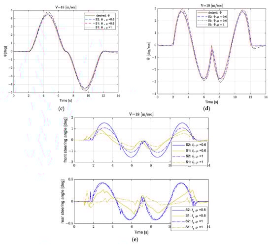 Simulation results for different friction values (µ = 0.6 & 1) by two control strategies. “S1: first Strategy, S2: second Strategy”: (a) the lateral displacement; (b) lateral velocity; (c) the yaw angle; (d) the yaw rate; (e) steering angles.