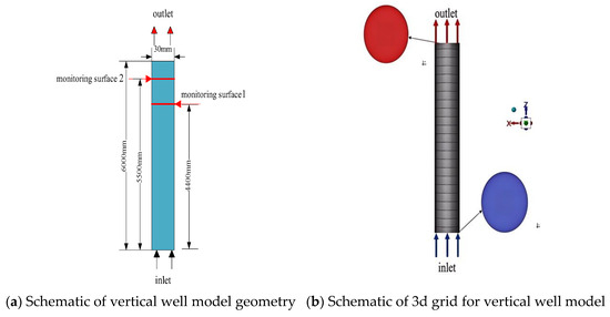 A vertical well model with a diameter of 30 mm was established. To ensure adequate flow of heavy oil–water two-phase fluid, the length of the model well was set to 20 times the well diameter (6000 mm), and flow parameter monitoring surfaces were established at 4500 mm and 5500 mm of the model. The geometric structure is shown in Figure 1a. The model was then discretized into a grid, and boundary layers were set near the wellbore wall, as shown in Figure 1b.