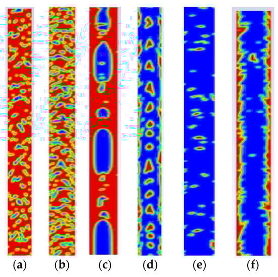 Therefore, the liquid holdup data of the flow patterns were recorded at the monitoring surface located at 5500 mm of the model (as shown in Figure 1a). Through the analysis of three types of information, including the liquid holdup curve, the probability density function (PDF) curve of liquid holdup, and the flow pattern contour maps of oil–water two-phase flow, six typical heavy oil–water two-phase flow patterns were identified: water-in-oil bubble flow (B W/O, as shown in Figure 4a), transitional flow (TF, as shown in Figure 4b), water-in-oil slug flow (S W/O, as shown in Figure 4c), oil-in-water bubble flow (B O/W, as shown in Figure 4d), oil-in-water very fine dispersed flow (VFD O/W, as shown in Figure 4e), and water-in-oil core-annular flow (Core-annular W/O, as shown in Figure 4f). In the flow pattern contour maps, the oil phase is represented by red, and the water phase is represented by blue.
