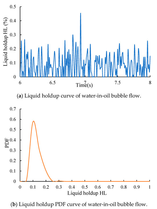 Liquid holdup and liquid holdup PDF curve of water-in-oil bubble flow.