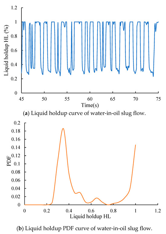 As shown in Figure 7, the liquid holdup curve of the water-in-oil slug flow exhibited an overall low-frequency vibration phenomenon. This is because the water slug passing through the monitoring plane is relatively long within a unit of time. The liquid holdup curve displays a characteristic of gradual decline and steep rise. This is due to the relatively smooth head of the water slug, resulting in a gradual decrease in liquid holdup when the slug passes through the monitoring plane. After the water slug passes, the oil phase mixed with fine water bubbles begins to pass through the monitoring plane, causing the liquid holdup to sharply rise to its highest value. The presence of fine oil bubbles leads to uneven peaks in the curve. In addition, the PDF curve of liquid holdup exhibits a bimodal feature, with one peak at a low liquid holdup (0~0.4) and another peak at a high liquid holdup (close to 1).
