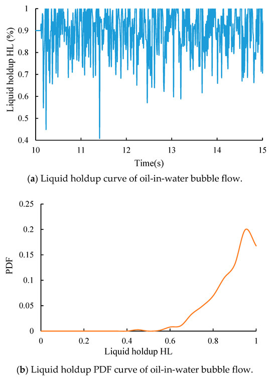 As seen in Figure 8, the liquid holdup curve of oil-in-water bubble flow exhibits high-frequency vibrations due to the influence of relatively dense small oil bubbles. The liquid holdup values generally oscillate within the range of 0.7 to 1, with occasional abnormally large values resulting from the aggregation of adjacent oil bubbles. Additionally, the randomness of oil bubble formation is quite strong, manifesting in a wide range of changes in liquid holdup values. The PDF curve of liquid holdup presents a unimodal shape, and the liquid holdup value at the peak is close to one.