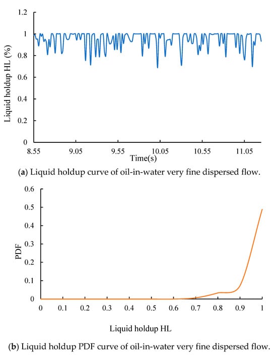 According to Figure 9, the liquid holdup curve of the very fine dispersed oil-in-water bubble flow vibrates slightly at a low frequency, indicating that the water bubbles passing through the monitoring plane per unit time are small and few in number. The liquid holdup value generally vibrates between 0.8 and 1, and the PDF curve of the liquid holdup exhibits a single peak at a liquid holdup value of 1.