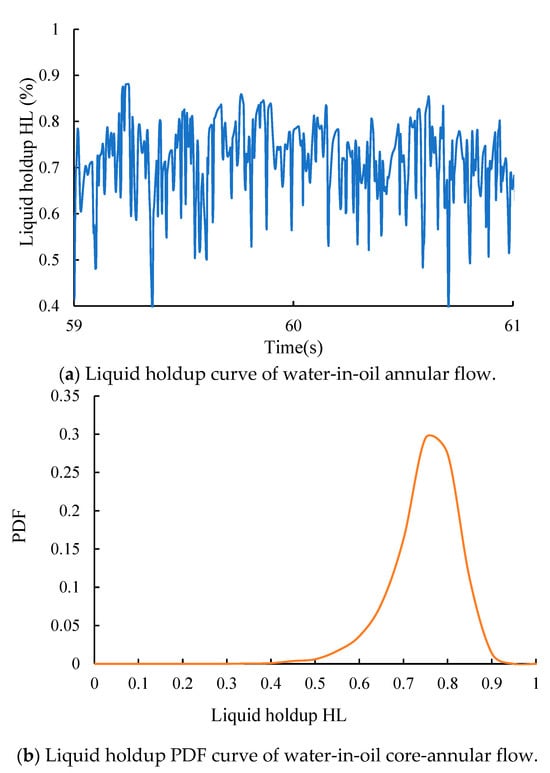 As can be seen from Figure 10, the liquid holdup curve of oil-in-water core-annular flow exhibits high-frequency vibrations, oscillating around the average liquid holdup (0.7 in the Figure 10.). This is due to the interfacial fluctuation characteristics between the oil and water phases. The PDF curve of liquid holdup features a single peak, which is located at the average liquid holdup (0.7 in the Figure 10.).