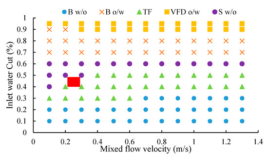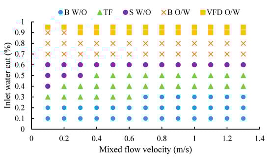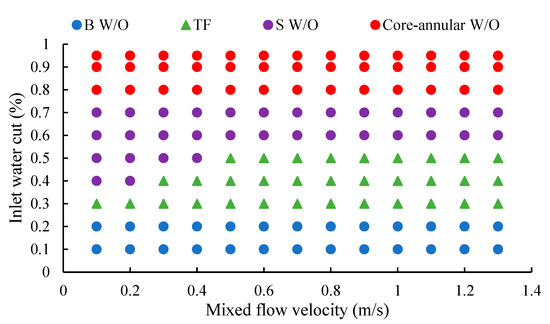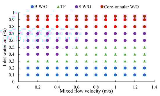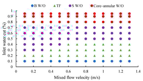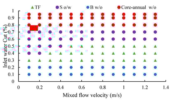 Compared to the flow pattern map at 1100 mPa·s (Figure 13), the flow patterns remain the same. However, in the range of inlet water cut from 0.4 to 0.5 and mixed flow velocity from 0.1 to 0.5 m/s, some TF transitions into S W/O.