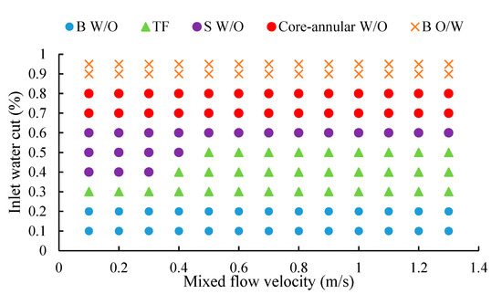 Figure 15 illustrates the oil–water two-phase flow pattern map for heavy oil with a viscosity of 5000 mPa·s. At an inlet water cut of 0.1, the flow is B W/O. TF emerges when the inlet water cut ranges from 0.2 to 0.4. The flow pattern transitions to S W/O between an inlet water cut of 0.3 and 0.7. Core-annular W/O appears when the inlet water cut exceeds 0.8.