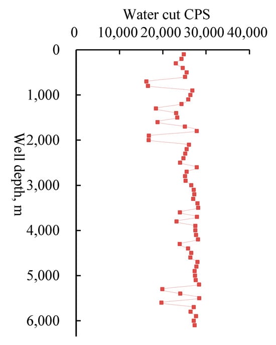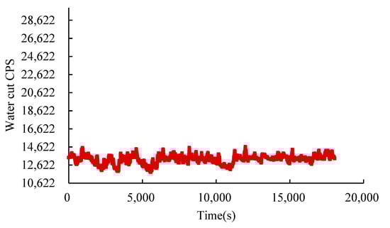 As seen in Figure 16, during the continuous downward testing process, a large water slug appeared at a well depth of 2000 m, and a small water slug flow occurred at a depth of 6000 m. The reason for the slugging is that after blending with diluent, the viscosity of crude oil decreases, and the water slug segment is broken up. As the temperature gradually decreases, the viscosity of heavy oil increases, causing water-in-oil slug flow to reappear near the wellhead. The curve in Figure 17 represents the change in water cut at a depth of 6352 m over the measured time. As can be seen from the Fig., the curve exhibits high-frequency fluctuations with small amplitudes, and the water cut is relatively high, indicating a water-in-oil annular flow.