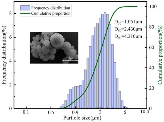 The micron-grade aluminum powder was obtained from Shanghai Titan Technology Co., Ltd., Shanghai, China. The dry measuring module of laser particle size distributor 2600 produced by Dandong Baite Instrument Co., Ltd., Dandong, China, eliminates the possibility of reaction between aluminum powder and liquid dispersant in the wet particle size measuring method. Three groups of samples were prepared for laser particle size analysis of aluminum powder, with each group containing approximately 5 g of the sample. Figure 1 shows the particle size distribution obtained from one of the measurements. According to the particle size distribution results, the D50 value is generally used to represent the average particle size of the sample group. The D50 values obtained from the three tests were 2.43 μm, 2.72 μm, and 2.53 μm, respectively, resulting in an average particle size of 2.56 μm for the micron-grade aluminum powder. The relative standard error of the average particle size is approximately 2.69%, indicating good repeatability and reliability. The original micromorphology of the sample powder was observed by scanning electron microscope Sigma300 (Carl Zeiss AG, Oberkochen, Germany) at 15 kV acceleration voltage and 200 KX magnification. The particle shape of the experimental sample belongs to spherical aluminum powder.
