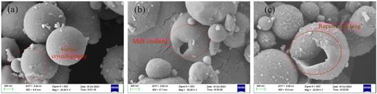 Changes in the surface morphology of the aluminum particles during the warming process were analyzed by SEM (Figure 2). At 600 °C, aluminum does not reach the melting point, and there is slight agglomeration on the surface (Figure 2a). The surface of the aluminum particles remains relatively intact, with no surface fractures observed. At 700 °C, aluminum undergoes melting. Due to the density difference between liquid and solid aluminum, internal volume expansion occurs, causing tensile stress on the alumina shell. This leads to atomic diffusion and the emergence of polyhedral structures. The particles deform and begin to exhibit fractures, with diameters of approximately 500 μm, as shown in Figure 2b. As the temperature continues to rise to 800 °C, the internal aluminum core is released and comes into contact with oxygen, enhancing the oxidation reaction. The aluminum core diffuses outward, reacting with the outer layer of oxygen to form a core–shell structure of alumina, ultimately resulting in a hollow structure, as depicted in Figure 2c. The number of white dot-like oxides on the particle surface significantly increases compared to Figure 2a, and the fracture gaps, approximately 800 μm in size, clearly exceed half of the particle diameter.