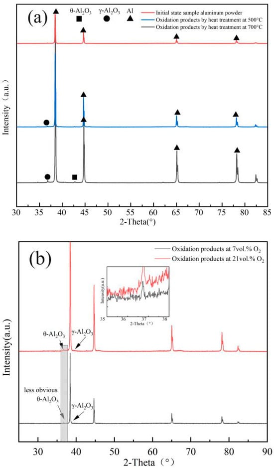 As shown in Figure 3a, in the XRD spectra of the oxidation product at 500 °C, only diffraction peaks of metallic aluminum are observed, and no diffraction peaks of crystalline alumina are found. The weak diffraction peaks of γ-Al2O3 and θ-Al2O3 can be observed in the XRD spectra of the product at 700 °C. At this temperature stage, the crystalline alumina on the surface of solid aluminum particles transformed from an amorphous state to γ-Al2O3, which may be an important reason for the sharp increase in the oxidation rate. As shown in Figure 3b, compared to oxidation under atmospheric conditions, the diffraction peaks of the oxide products γ-Al2O3 and θ-Al2O3 formed when aluminum particles are oxidized in an atmosphere with 7% oxygen concentration are less pronounced. This suggests that the oxidation of micron-sized aluminum particles in a low-oxygen environment is less influenced by the gas diffusion mechanism due to the reduced availability of O2 molecules. Consequently, the formation of γ-Al2O3 requires more energy and a higher temperature. Therefore, when aluminum powder is heated to the same final temperature under oxygen-deficient conditions, the intensity of the diffraction peaks of various crystal forms in the XRD patterns is observed to be lower.
