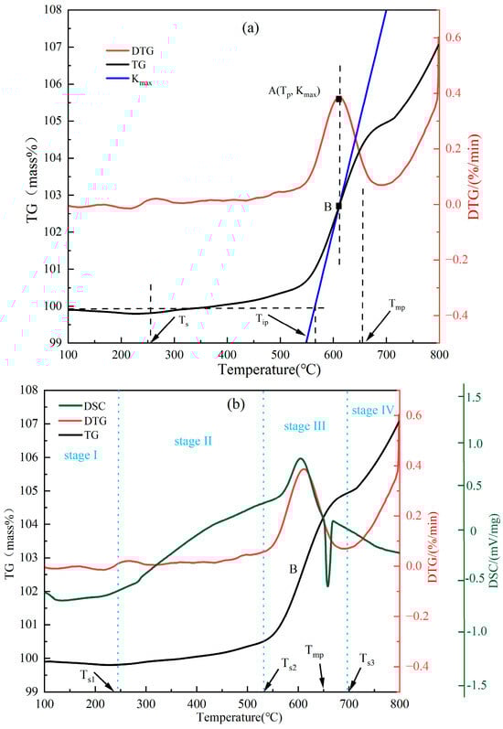 4. Tip: ignition point; the temperature at which the sample aluminum powder particles undergo a sudden change in temperature, accompanied by strong chemical and exothermic reactions. The onset reaction temperature Tip was determined in this experiment using the tangent method of the TG–DTG curve. The intersection point of the DTG curve and the TGA curve is labeled as B. The temperature at which the tangent line Kmax intersects the baseline of the TGA curve at B is defined as the ignition temperature of the aluminum powder.