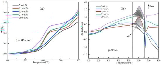 The variation curves of the original heat flow density (DSC) of the sample powder oxidized in five oxygen concentration ambient atmospheres at a heating rate of 5 K·min−1 are shown in Figure 5b. The first peak of the heat flow profile of the aluminum powder in the oxidation process appeared at around 600 °C, accompanied by the upward peak, and the rapid oxidation of the aluminum powder occurred. Subsequently, a section of heat absorption peak caused by the melt phase transition appeared within 650~670 °C. The starting oxidation temperature points (Ts) 568.7, 565.9, 558.9, 564.1, and 551.6 °C for aluminum at oxygen concentrations of 7%, 11%, 15%, 21%, and 30% were calculated to be 37.60, 32.5, 27.40, 6.73, and 2.38 J/g, respectively, of the specific exothermic heat of oxidation occurring during the rapid oxidation stage of aluminum. For the aluminum–oxygen reaction system in a low oxygen concentration atmosphere, the exothermic amount of aluminum powder is significantly reduced. The reduction of oxygen concentration reduces the number of oxygen molecules in contact with the surface of the aluminum powder in the reaction system, and the transition time of the aluminum powder from oxidation to combustion stage will grow, thus suppressing the degree of aluminum oxidation.