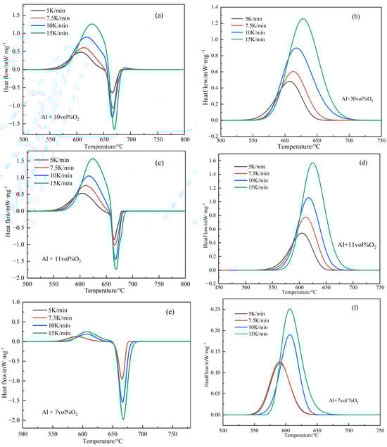 The DSC heat flow curves of aluminum powder samples after decoupling the melting phase transition and oxidation reaction under (a) 30% O2, (c) 11% O2, and (e) 7% O2 oxygen concentration atmosphere and the corresponding heat flux curves of the oxidation exothermic stage at (b) 30%, (d) 11%, and (f) 7% O2 oxygen concentrations.