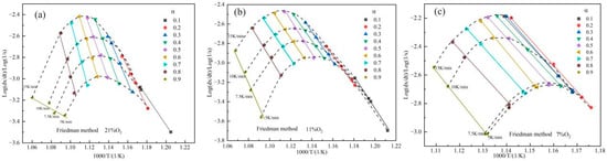Fitting curve of oxidation process of micrometer aluminum powder under (a) 21 vol%, (b) 11 vol%, and (c) 7 vol% oxygen concentration atmospheres, based on Friedman method.