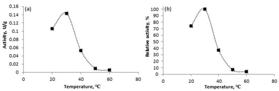Effect of temperature on the activity of free laccase from T. versicolor: (a) total activity; (b) relative activity.