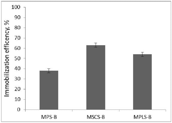 The efficiency of enzyme immobilization onto MPS-B, MSCS-B and MPLS-B is calculated and presented in Figure 2. As shown in Figure 2, the immobilization efficiency was 62% for MSCS-B, 54% for MPLS-B, and 36% for MPS-B. Fatarella et al. [26] demonstrated an immobilization efficiency of 59.4% by immobilizing laccase on Nylon 6 film hydrolyzed by HCl under similar conditions, room temperature and pH = 4.5, but with a significantly longer contact time (12 h). Based on the presented results, MSCS-B demonstrates the highest effectiveness as a support for laccase immobilization, prompting further investigations with this biochar.