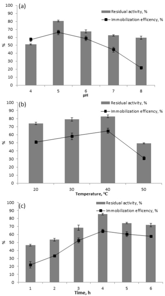 Influence of (a) pH; (b) temperature; (c) contact time on immobilization efficiency and residual activity in the immobilization of laccase on MSCS-B.