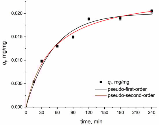 A kinetic study was conducted to determine the adsorption mechanism of laccase on MSCS-B. The experimental data are fitted by pseudo-first-order and pseudo-second-order kinetic models; the obtained fitting data are given in Table 1, while the graphs are presented in Figure 4.