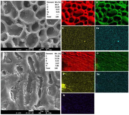 The material characterization using SEM imaging and EDX mapping provide a detailed analysis of surface morphology and elemental composition of the modified biochar samples before and after laccase immobilization-LMSCS-B (Figure 5). The SEM-EDX analysis of biochar derived from non-modified sour cherry stones conducted in our previous study [30] revealed a porous structure with irregular cracks and channels. After the acid treatment of the biochar (Figure 5a), a heterogeneous surface with deeper pores was observed, attributed to the removal of impurities from the pores by the acid treatment [7]. Similar findings are obtained by the SEM analysis of Al-sareji et al. [27], who investigated the effect of the acid treatment of activated carbon from a coconut shell. The SEM morphology of laccase immobilized on biochar, LMSCS-B (Figure 5b), did not reveal significant alterations in the surface topography. This is probably due to the relatively small dimension of the laccase protein, between 60 and 90 kDa [15], which corresponds to a particle size of less than 5 nanometers. Such a small dimension is difficult to capture by micrographs with a 1 µm magnification [31]. However, after laccase immobilization, the surface of MSCS-B appears smoother, which can be attributed to the enzyme coating on the surface of the biochar. The most important fact observed from the EDX analysis is the significant amount of nitrogen (7.86%) after enzyme adsorption, confirming the successful binding of laccase on the biochar surface. These findings are consistent with other studies that have investigated laccase immobilization on carbon materials [7,32,33].