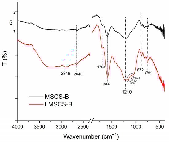 The FTIR spectra of MSCS-B and LMSCS-B recorded by FTIR analysis are shown in Figure 6. The sharp peak observed at 2916 cm−1 in LMSCS-B corresponds to the C–H stretching of the -CH2 group [34]. The peak at 2646 cm−1 suggests the presence of aliphatic (–CHn) groups in the biochar [30]. The broad bands at 1600–1703 cm−1 are attributed to the C=O stretching bonds in the carboxylic acid functional groups formed as a result of acid treatment [35]. During the functionalization process, the carbon structure breaks down, leading to an increased generation of an electric dipole. This behavior is due to the bonding of carboxyl groups on the biochar surfaces and the multiplication of defects caused by the oxidation of mixed acid [36]. After laccase immobilization, the signal peak at 1600 cm−1 increased, possibly owing to the additional carbonyl groups of the enzymes [14]. The broad peak observed around 1210 cm−1, related to the C–O stretching vibration of phenolic hydroxyl groups on the biochar’s surface, was followed by the appearance of a triplet at 1116, 1104 and 1080 cm−1 after laccase adsorption, which is characteristic of the laccase protein [37]. This finding supports the results obtained by the EDX analysis, which detected nitrogen, originating from these proteins. The broad absorption peaks between 756 and 872 cm−1 are associated with aromatic compounds present on the investigated sample’s surface [38].