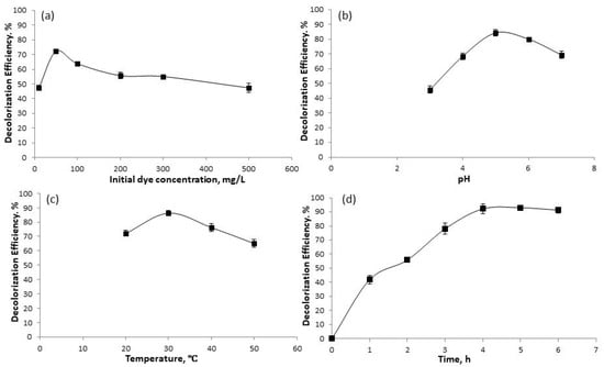 After optimizing the immobilization process of laccase on the MSCS-B support, the oxidative activity of the immobilized enzyme was investigated for the decolorization of the toxic dye BG. To achieve efficient dye degradation and further optimize the process, various parameters were examined, including the influence of temperature, pH, time, and dye concentration. The results of these investigations are presented in Figure 7.