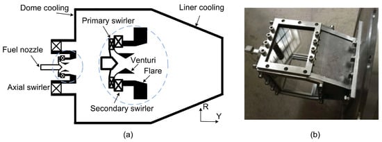 A schematic of the aero engine model combustor used for the flow measurements is shown in Figure 1. The burner features a centrally staged arrangement of swirling injectors consisting of two stages: the central pilot stage and the outer main stage. The two stages are separated by a lip structure, which plays an important role in flame stabilization. A swirl cup design is applied as the pilot stage with dual radial swirlers, generating the inner swirling flow. The main stage adopts an axial swirler containing 20 straight blades with a swirl number of 0.5. The combustor is equipped with quartz windows on the side wall, allowing full optical access.