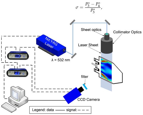 Particle Image Velocimetry (PIV) is an effective diagnostic method for the flow field. Its system is shown in Figure 2, consisting of a double-cavity Nd:YAG laser with 10 Hz repetition (532 nm), a CCD camera (double-shutter, Lavision), a programmable timing unit (PTU), and a commercial PIV software (FlowMaster). The 532 nm laser beam is reflected by multiple mirrors and converted to a laser sheet with a height of 75 mm and thickness of 1 mm via the sheet optics and the collimator optics. This vertical laser sheet is used for the illumination inside the combustor. The time interval between two laser pulses is 15 s. The air is seeded with particles, 1 m in diameter, at 1.5 m upstream of the combustor, ensuring the tracers are distributed uniformly. Mie scattering light from the tracers is collected by the CCD camera with the stray light filtered by a filter (532 nm ± 5 nm).