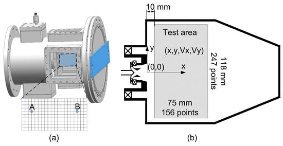 Ambient air at room temperature and atmospheric pressure is supplied to the swirl combustor from a plenum. Inlet total pressure of the combustor is monitored via a pressure piezometer. Size calibration of the camera pixel is performed before PIV experiments, as shown in Figure 3a. The effective imaging area is 75 mm × 118 mm and contains 156 × 247 sampling points. The air velocity fields are generated from the raw Mie scattering images using the software FlowMaster. The multi-scale cross-correlation is carried out with the interrogation window size of 16 pixels × 16 pixels and an overlap of 50%. A total of 500 instantaneous velocity fields are averaged to obtain the time-averaged flow fields. Flow fields are measured at a total pressure drop ratio () ranging from 1% to 5%. The is defined as []